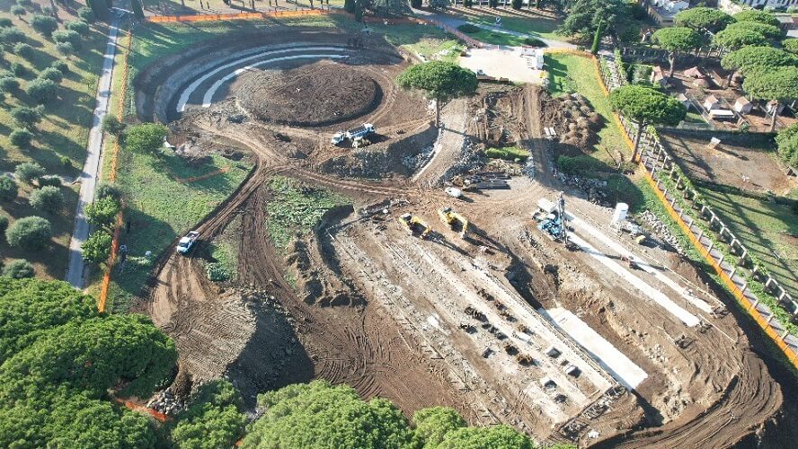 Durante gli scavi abbiamo trovato una vena di peperino, una roccia molto resistente tipica di queste zone. Abbiamo dovuta estrarla e romperla con scavatori adatti e, in un’ottica di economia circolare, ha rappresentato un’opportunità progettuale: è stata tutta riutilizzata per creare i muri di contenimento delle terre di riporto, trasformando un imprevisto tecnico in un elemento architettonico e identitario dei giardini. Anche in questo caso è prevalso il concetto di ri-uso. Questo intervento testimonia una visione progettuale capace di coniugare adattabilità, rispetto del luogo e valorizzazione delle risorse locali, trasformando le sfide operative in valore ambientale.