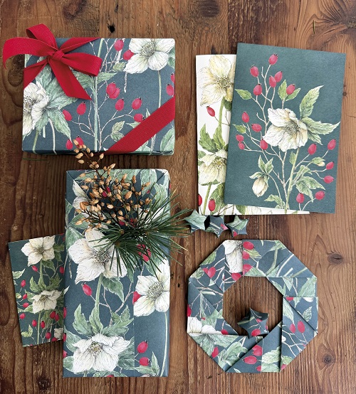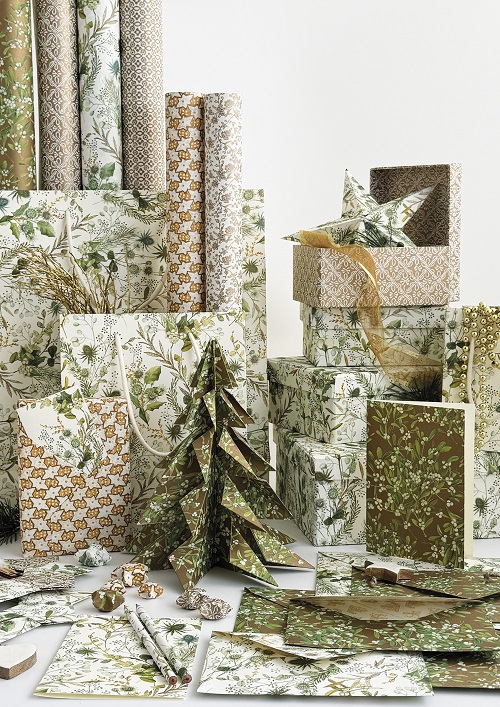 Tante poi le fantasie che trasportano in un mondo magico, in un vero e proprio viaggio attraverso stili e atmosfere natalizie: la fantasia Vischio Oro, dove la bacca più iconica e benaugurante risplende su un sontuoso sfondo dorato, o la Composizione Floreale Verde e Oro, in cui una varietà di piante e ramoscelli tipici del periodo invernale si intrecciano con delicata leggiadria su uno sfondo avorio. Un profondo verde accoglie invece i candidi fiori e le rosse bacche della fantasia Helleboro Bianco, definiti con estrema cura per un autentico effetto trompe l’œil, quasi a voler prolungare la magia di questi giorni speciali.