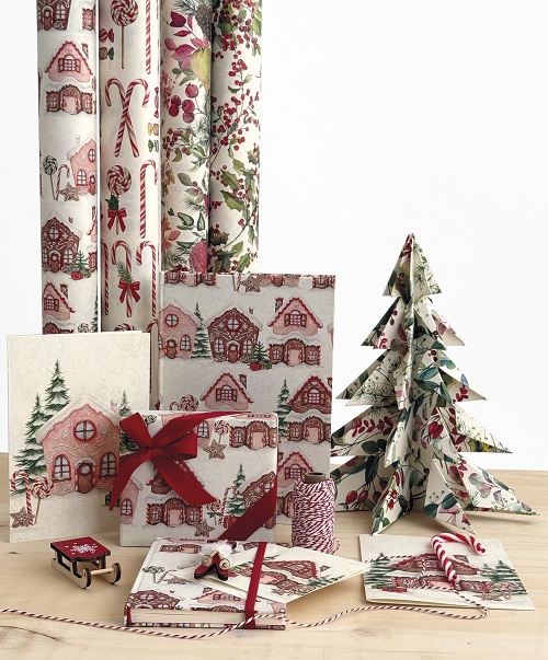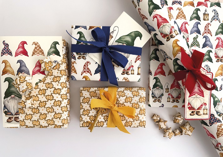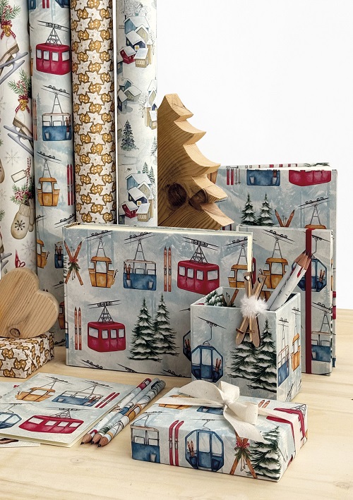 Tra le nuove fantasie spicca Funivie, per lasciarsi trasportare tra le vette innevate dell’inverno: un omaggio alle Alpi e alle tradizioni montane, dove il bianco della neve e il calore delle cabine colorate si fondono in un disegno che evoca l’aria frizzante delle vacanze sulla neve. Gnomi e Cappelli riprende lo spirito giocoso e tipico della stagione, popolata da allegri gnomi e dai loro inconfondibili cappelli, un richiamo alle leggende del Nord, qui arricchiti da motivi classici remondiniani che aggiungono il tocco di unicità e distintiva ricercatezza. Richiamano alla memoria il profumo e la dolcezza della tavola natalizia le carte Casette Pan di Zenzero, dove accoglienti casette decorate con glassa e caramelle si inseriscono in un paesaggio invernale, simbolo delle più amate tradizioni delle feste.