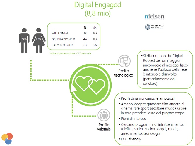 Seguono poi i Digital Engaged (8,8 milioni, 17%), che utilizzano la rete in modo più intenso e disinvolto, guardano con fiducia a nuove forme di pagamento ma mantengono un legame con il punto vendita.