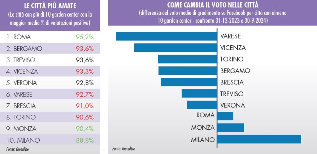 Tra le città con almeno 10 garden center analizzati sale al primo posto Roma con il 95,2% di giudizi positivi, seguita da Bergamo e Treviso (entrambe 93,6%) e Vicenza (93,3%). Nel 2024 quasi tutte le città hanno peggiorato il proprio giudizio medio a eccezione di Milano, Monza e Roma.