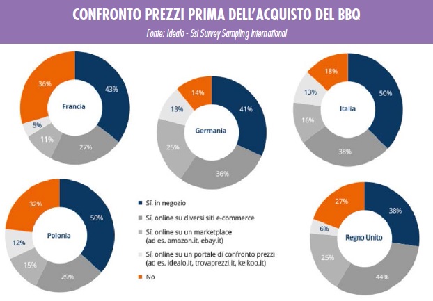 Per fotografare il fenomeno ci viene in aiuto una ricerca condotta nella scorsa estate da Ssi Survey Sampling International per Idealo, un sito di comparazione prezzi, che ha intervistato più di 2.500 utilizzatori di barbecue di 5 paesi (Germania, Francia, Polonia, Regno Unito e Italia). In Italia svolgono ancora un ruolo fondamentale i negozi specializzati e solo l’8% degli inter vistati ha acquistato il barbecue in un e-shop, ma è interessante rilevare come la percentuale dell’e-commerce salga al 23% in Germania e al 18% del Regno Unito.