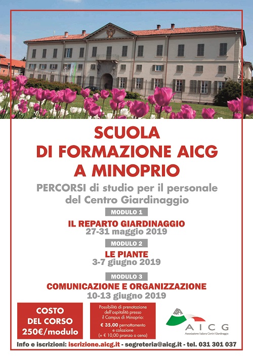 La seconda edizione dei corsi di formazione Aicg si terrà dal 27 maggio al 13 giugno 2019 e dal 7 al 10 gennaio 2020, presso la Fondazione Minoprio di Vertemate con Minoprio (CO), con quattro percorsi di studio per il personale dei centri di giardinaggio su quattro diverse tematiche. Le lezioni saranno tenute da docenti della Fondazione Minoprio e da formatori esterni (esperti del settore e professionisti aziendali).