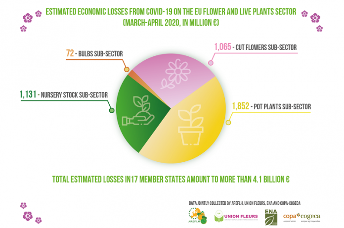 Perdite per fiori e piante di 4,12 miliardi di euro nel periodo marzo-aprile in 17 paesi europei, pari a circa il 10% del giro d’affari annuale del mercato europeo: è quanto stimato in seguito a un’analisi promossa dalle quattro organizzazioni che rappresentano i vari segmenti del mondo florovivaistico nell’Unione Europea (Union Fleurs, Ena, Areflh e Copa-Cogeca).