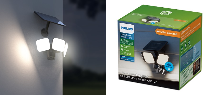Nella gamma solare spicca la luce di sicurezza Zyren, con 4000 lumen, IP65 e la presenza di un pannello solare separato dalle sorgenti luminose, con angolo regolabile, per poter sfruttare al massimo e immagazzinare la luce del Sole, riducendo i costi energetici e minimizzando gli impatti ambientali. Dotata di sensori che regolano l’accensione al crepuscolo e lo spegnimento all’alba, Zyren ha due modalità di funzionamento: l’automatica in cui la luce si accende solo quando il sensore avverte un movimento fino a 14 metri di distanza e la on, in cui la luce rimane costante a 20 lumen finché non si avverte un passaggio che spinge i lumen alla massima potenza. Con la regolazione di tempi e sensibilità, si può arrivare fino a 36 ore di autonomia. Inoltre, è integrato dal Led Ultra Efficient Solar,una tecnologia brevettata che ottimizza al massimo la conversione energetica.